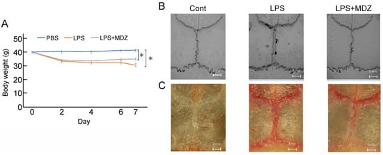 Morphological observations of the effect of MDZ on LPS-induced calvarial mouse model. (A) Changes in the body weight of mice during the treatment period. Values are the means ± standard error of the mean (SEM) for six mice (* p < 0.05, Steel–Dwass test). (B) Representative micro-CT 3D reconstruction images of mouse calvaria (Scale bar = 1 mm). (C) Representative stereomicroscopic images of TRAP staining showing osteoclastogenesis in each sample. Cont: PBS-alone dosage group (i.e., control); LPS: LPS-only dosage group; LPS+MDZ: combination of LPS and MDZ dosage group (Scale bar = 1 mm). LPS: lipopolysaccharide; MDZ: midazolam; micro-CT: micro-computed tomography; TRAP: tartrate-resistant acid phosphatase.