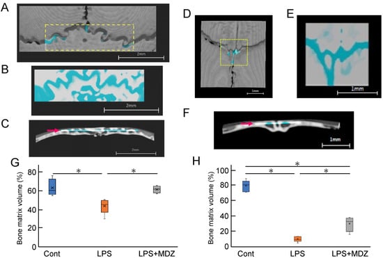Validation of bone matrix volume on bone destruction in LPS-induced calvarial mice. (A,D) Representative images showing the location of lambdoidal (A) and coronal (D) sutures for measurement of bone matrix volume. For each mouse, a block of lambdoidal (1120 µm long × 4000 µm wide) and coronal (1600 µm long × 1600 µm wide) suture in the area indicated by the yellow dotted box was created using a 3D reconstruction software (TRI/3D-BON-FCS64, RATOC, Tokyo, Japan). Scale bars = 2 mm for (A) and = 1 mm for (D). (B,E) Representative images of the upper part block of lambdoidal (B) and coronal (E) sutures. Bone matrix area is shown in white or gray and seam or bone destruction areas are shown in light blue. Scale bars = 2 mm for (B) and = 1 mm for (E). (C,F) Representative images of the lateral block of lambdoidal (C) and coronal (F) sutures. The thickness of each block, indicated by the red arrow, was 365 µm for lambdoidal suture and 231 µm for coronal suture. Scale bars = 2 mm for (C) and = 1 mm for (F). (G,H) Average bone matrix volume of lambdoidal (G) and coronal (H) sutures in each group. The average bone matrix volume for each group was calculated using the 3D reconstruction software. The measurement for each group was performed independently for six mice (n = 6). The asterisks (*) indicate significant differences between each group (* p < 0.05, Steel–Dwass test). Cont: PBS-alone dosage group (i.e., control); LPS: LPS-only dosage group; LPS+MDZ: combination of LPS and MDZ dosage group. LPS: lipopolysaccharide; MDZ: midazolam.