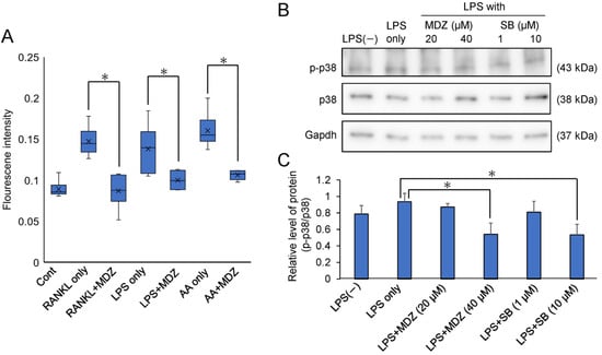 We determined the mechanism by which MDZ inhibits osteoclast differentiation. We focused on reactive oxygen species (ROS) produced in the mitochondria because ROS regulate the p38 mitogen-activated protein kinase (p38 MAPK) pathway, which is important for osteoclast differentiation. Figure 7A shows the effect of MDZ on ROS production during the differentiation of RAW264 cells. Antimycin A, which is a fungal antibiotic that inhibits complex III of the mitochondrial electron transport system and produces ROS when applied to cells, was used as a positive control []. The ROS production in RAW264 cells cultured with antimycin A, RANKL alone, or LPS alone was higher (1.72-, 1.55-, and 1.80-fold for RANKL alone, LPS alone, and antimycin A, respectively) than that in the control cells. However, the ROS production in cells cultured in the presence of MDZ was suppressed to levels similar to that found in the control cells. To further investigate the effect of MDZ on p38 phosphorylation and ROS production, we performed Western blot analysis for phosphorylated p38 (p-p38) and p38 using proteins extracted from LPS-treated RAW264 cells (Figure 7B and Figure S5). Using densitometric analysis, we determined the relative levels of p-p38 and p38 (i.e., p-p38/p38) normalized against Gapdh levels (Figure 7C). The p-p38/p38 ratio was enhanced 1.2-fold when RAW264 cells were cultured in the presence of LPS (LPS only) compared with that in RAW264 cells cultured without LPS (i.e., LPS(−). In contrast, the p-p38/p38 ratio was suppressed in a concentration-dependent manner in RAW264 cells cultured with LPS and MDZ. Similarly, in another control, in cells cultured with LPS and SB203580, a p38MAPK inhibitor, the p-p38/p38 ratio decreased in a concentration-dependent manner. In particular, the p-p38/p38 ratio in cells cultured with LPS and 40 µM MDZ or with LPS and 10 µM SB203580 was significantly reduced relative to that in cells cultured with LPS alone (1.73-fold for LPS and 40 µM MDZ, and 1.75-fold for LPS and 10 µM SB203580).