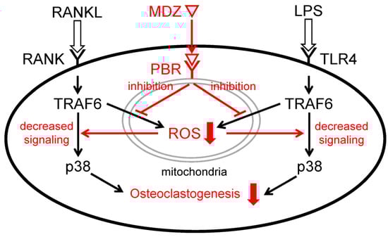 The p38 MAPK is one of the signaling pathways that play an important role in osteoclast differentiation [,]. When LPS is sensed by TLR4, ROS are produced in the mitochondria and activate apoptosis signal-regulating kinase 1 (ASK1) bound toTRAF6, a target of ROS. Following the activation of ASK1, downstream p38 is also activated [,]. In the present study, we found that MDZ inhibits p38 MAPK signaling at the protein level. Taken together with the previously mentioned results of suppression of ROS production by MDZ, the potential mechanism behind the suppression of osteoclast differentiation by MDZ in the present study, as shown in Figure 8, involves suppression of ROS production in mitochondria by MDZ via PBR and negative regulation of the TRAF6-p38 pathway induced by RANKL or LPS.