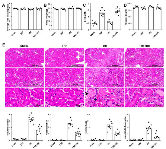 TRF’s impact on kidney damage in renal IRI. (A) Food intake. (B) Body weight. (C) β-HB level. (D) Glucose level. (E) Exemplary images of H&E staining. Tubular necrosis (black arrowhead), cast formation (white arrowhead), hemorrhage (black arrow), and interstitial inflammation (white arrow). The results are shown as means ± standard deviations. There were six subjects per group. * p < 0.05 compared to the sham group. # p < 0.05 compared to the IRI group.