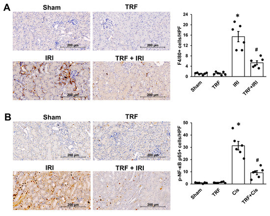 TRF’s impact on inflammation in renal IRI. Exemplary images of immunohistochemical analyses for F4/80 (A) and p-NF-κB p65 (B). The results are shown as means ± standard deviations. There were six subjects per group. * p < 0.05 compared to both the sham and TRF groups. # p < 0.05 compared to the IRI group.