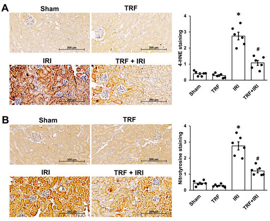 TRF’s impact on oxidative stress in renal IRI. Exemplary images of immunohistochemistry for 4-HNE (A) and nitrotyrosine (B). The results are shown as means ± standard deviations. There were six subjects per group. * p < 0.05 compared to both the sham and TRF groups. # p < 0.05 compared to the IRI group.