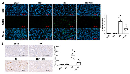 TRF’s impact on tubular apoptosis in renal IRI. Exemplary image of TUNEL staining (A) and immunohistochemical analyses for cleaved caspase-3 (B). The results are shown as means ± standard deviations. There were six subjects per group. * p < 0.05 compared to both the sham and TRF groups. # p < 0.05 compared to the IRI group.