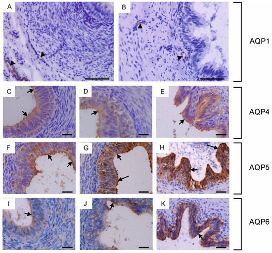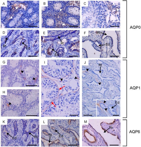 - Mohamed, E.A.; Im, J.W.; Kim, D.H.; Bae, H.R. Differential Expressions of Aquaporin Subtypes in the Adult Mouse Testis. Dev. Reprod. 2022, 26, 59–69. [Google Scholar] [CrossRef]