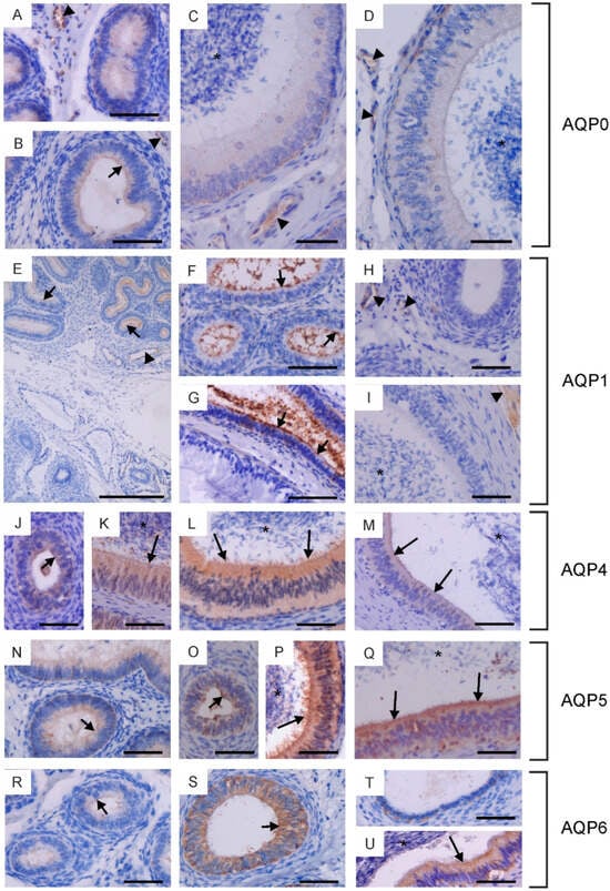 - Oberska, P.; Grabowska, M.; Marynowska, M.; Murawski, M.; Gączarzewicz, D.; Syczewski, A.; Michałek, K. Cellular Distribution of Aquaporin 3, 7 and 9 in Male Reproductive Tract: A Lesson from Bovine Study (Bos taurus). Int. J. Mol. Sci. 2024, 25, 1567. [Google Scholar] [CrossRef]