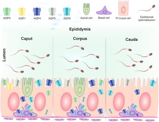 - Badran, H.H.; Hermo, L.S. Expression and Regulation of Aquaporins 1, 8, and 9 in the Testis, Efferent Ducts, and Epididymis of Adult Rats and during Postnatal Development. J. Androl. 2002, 23, 358–373. [Google Scholar] [CrossRef] [PubMed]