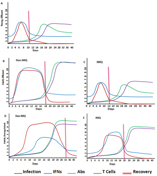 Protective immunity and deregulated immunity. (A) Mild SARS-CoV-2 infection is associated with early production of type I interferons (IFNs), efficient adaptive immunity, and faster resolution of viral infection. (B) Adult people with an efficient immune system develop moderate SARS-CoV-2 infection, associated with normal production of type I IFNs, normal humoral and cellular immunity, and increased or systemic SARS-CoV-2 proliferation, associated with highest symptoms but very low mortality [48]. (C) IMQ immune stimulation in adults with efficient immune system could induce elevated levels of type I IFNs, decreasing SARS-CoV-2 proliferation, and improves the humoral and cellular immune responses. (D) Deregulated immune system in adults develops severe SARS-CoV-2 infection, associated with delayed production of type I IFNs, slow humoral and cellular immunity, and increased systemic SARS-CoV-2 proliferation associated with more severe symptoms, with increased mortality [35]. (E) In those with a deregulated immune system, IMQ could restore the immune efficiency, which could result in faster resolution of COVID-19, less systemic damage, higher possibilities of survival, and lower possibilities of developing Long-COVID.
