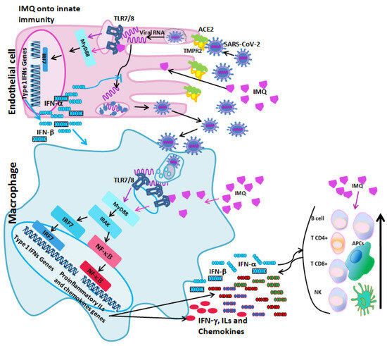 Although SARS-CoV-2 has mechanisms to evade the action of IFNs, it appears that this viral evasion is less effective in individuals with a robust innate immune system, such as children and young adults, who largely do not develop moderate or severe cases of COVID-19 [124]. In contrast, this viral evasion seems to be more effective in individuals with a deregulated immune system. Therefore, IMQ could improve or restore the function of the immune system in people with immune deregulation, generating a better protective response against infection or through the application of vaccines. With an increase in the number of individuals with an efficient immune response, the dispersion rate of the virus in populations will be decreased [199,200].
