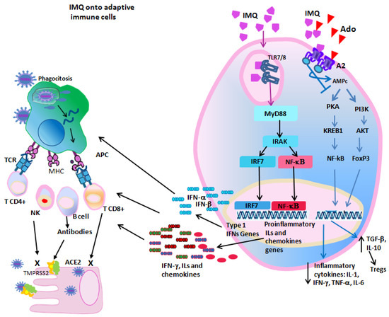 When topically applied to treat skin cancer, IMQ activates at least 3000 genes, including those that play roles in inflammation, immune response, and the upregulation of apoptotic signaling pathways [158,159]. Consequently, through the activation of TLRs, IMQ holds significant promise in the treatment of viral infectious diseases that rely on cellular immunity. Clinical protocols for the treatment of genital warts caused by the human papillomavirus (HPV) have provided valuable insights into its beneficial and adverse effects [157,160,161,162,163,164]. Interestingly, the application of IMQ to one mucosal site of the body can induce systemic immunostimulation, including the stimulation of mucosal immunity at other sites as well [138]. Additionally, IMQ interacts as an antagonist with adenosine receptors A2AR (Figure 3), potentially contributing to its inflammatory and immunostimulatory effects [149,156]. Because immune cells excrete exosomes according to their molecular profile [165], modifying the immune profile with IMQ could exchange the miRNA profile in susceptible SARS-CoV-2 subjects, generating an efficient Th1 profile of miRNAs.