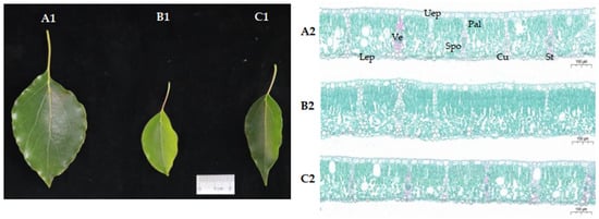 Leaf phenotype and tissue structure in the MLs, RLs, and YLs of a 2000-year-old ancient C. camphora and its 2-year-old cutting plantlets (A: ML, B: RL, C: YL; Subscript 1: leaf phenotype, Subscript 2: tissue structure). (Uep: upper epidermis, Pal: palisade tissue, Spo: spongy tissue, Ve: vessel, Lep: lower epidermis, St: stomata, Cu: cuticle).