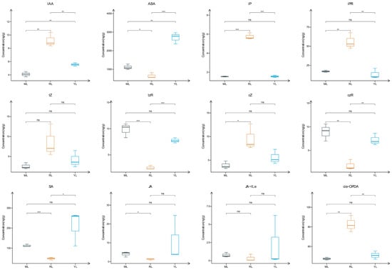 Boxplots of 12 plant hormone concentrations in MLs, RLs and YLs. Statistically significant differences were determined using Student’s t-test; the significance symbols ***, ** and * represent p values of 0.001, 0.01 and 0.05, respectively; ns represents not significant. (IAA (indole-3-acetic acid), ABA (abscisic acid), iP (isopentenyladenine), iPR (isopentenyladenosine), tZ (trans-zeatin), tzR (trans-zeatin riboside), cZ (cis-zeatin), czR (cis-zeatin riboside), SA (salicylic acid), JA (jasmonic acid), JA-ILe (jasmonoyl-isoleucine), and cis-OPDA (cis-12-oxo-phytodienoic acid)).