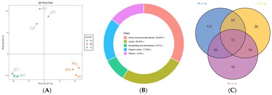 Metabolomic data analysis of YLs, MLs and RLs. Principal component analysis (PCA) (A), metabolite classes (B), and Venn diagram of DAMs (C).