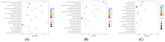 KEGG enrichment map of DAMs ((A) ML vs. RL; (B) YL vs. RL; (C) ML vs. YL).