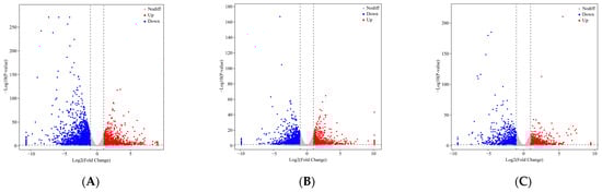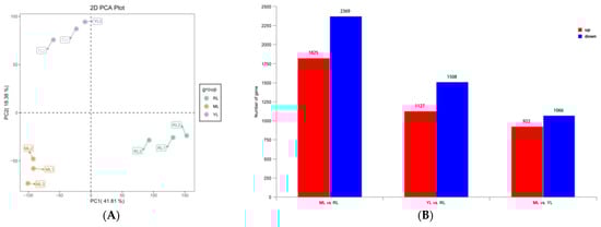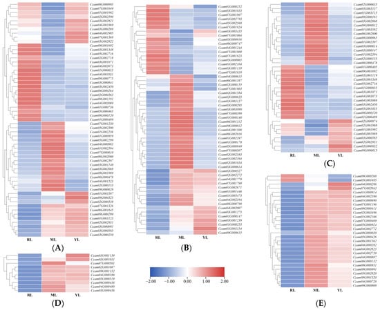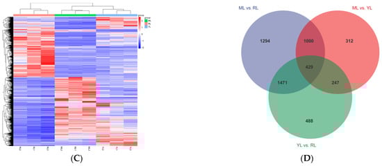 The PCA results showed that the YL, ML, and RL samples were clearly separated, so the sequence data and biological replicates could be used for subsequent analysis (Figure 5A). The gene annotation summary of RNA-seq data mapped to different databases is shown in Table S4. A total of 5241 DEGs were screened based on the criteria of |log2(Fold Change)| > 1 and p < 0.05 (Figure 5B, Table S5). The ML vs. RL comparison identified 4194 DEGs (1825 up-regulated and 2369 down-regulated). A total of 2635 DEGs (1127 up-regulated and 1508 down-regulated) were identified in the YL vs. RL comparison. The ML vs. YL comparison identified 1988 DEGs (922 up-regulated and 1066 down-regulated). The volcano plots of the DEGs are shown in Figure 6A–C for the comparative analysis of MLs, RLs, and YLs. Clustering analysis of 5241 DEGs is shown in Figure 5C between the YLs, MLs, and RLs. A Venn diagram of DEGs revealed 429 common DEGs between the comparative analyses of MLs, RLs, and YLs (Figure 5D).