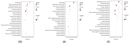 Annotation results of DAMs were classified according to a KEGG pathway type, as shown in Figure S3. Metabolic pathways contained the largest percentage of DAMs in the comparison analyses (ML vs. RL, YL vs. RL, and ML vs. YL). Enrichment analysis of the DAMs in the KEGG pathway was conducted, as shown in Figure 4, in which the rich factor was loosely positively related to the greater enrichment degree. The top 20 pathways ranked by p value are shown in Figure 4. In the ML vs. RL comparison, the DAMs were significantly enriched in the biosynthesis of various plant secondary metabolites and the biosynthesis of cofactor pathways (p < 0.05). In the YL vs. RL comparison, the DAMs were significantly enriched in the C5-branched dibasic acid metabolism and sulfur metabolism pathways (p < 0.05). In the ML vs. YL comparison, there was no significant enrichment of DAMs in any pathway (p < 0.05).