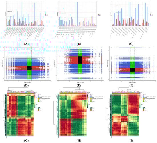 Conjoint analyses of DEGs and DAMs. KEGG enrichment (A–C), nine quadrant diagram (D–F), and correlation coefficient cluster heatmap (G–I). ((A,D,G): ML vs. RL; (B,E,H): YL vs. RL; (C,F,I): ML vs. YL).