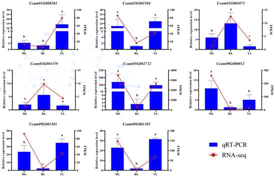 In order to verify the RNA-seq data of MLs, RLs, and YL, we selected eight genes to determine relative expression levels by qRT-PCR analysis, and they were gathered from the significant DEGs (Ccam01G000281, Ccam05G002712, Ccam09G001101, and Ccam09G001102) and important enriched pathways (plant hormone signal transduction: Ccam03G001071; MAPK signaling pathway–plant: Ccam03G001119 and Ccam09G000012; plant–pathogen interaction: Ccam02G001584). The results showed that the relative expression levels of qRT-PCR had a similar pattern trend with the FPKM values of RNA-seq data (Figure 9). Therefore, the transcriptome data were reliable and could be used for subsequent analysis.
