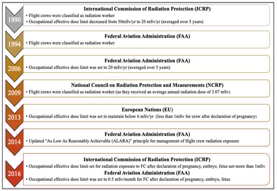 Regulatory oversight on exposure to cosmic ionizing radiation in flight crews. Timeline of considerations and amendments made by various regulatory agencies for exposure to occupational radiation in flight crews.