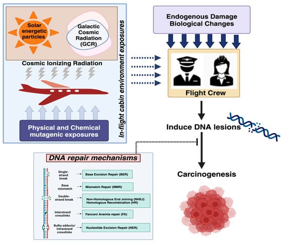 Multiple molecular pathways are involved in the repair of radiation-induced DNA damage. Variation in the efficiency of DNA repair pathways can govern an individual’s sensitivity to a mutagenic exposure, explaining their susceptibility to cancer. Accumulating unrepaired DNA lesions can contribute to mutations and cellular senescence, resulting in various adverse health outcomes [,,]. In this review, we present the current understanding of how DNA damage and repair in the context of exposure to CIR may explain, at least in part, the elevated risk of some types of cancer in FC. This review also outlines current knowledge regarding exposure to CIR during flights, discusses the available methods for detecting CIR, and provides a brief overview of the regulatory guidelines. We also present our perspectives on gaps in our understanding of CIR’s effects and what will be needed to understand the biological mechanisms in the field of DNA damage and repair underlying the excess cancer in FC to help develop appropriate radioprotection protocols for air travel [].