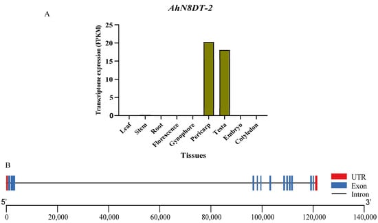 Expression and gene structure of AhN8DT-2 gene. (A) Transcriptome expression of AhN8DT-2 gene in different peanut tissues. Different tissues are given on the X-axis, while the Y-axis represents their Fragments Per Kilobase of transcript per Million mapped reads (FPKM) values. This graph uses the Mean FPKM values of the embryo, testa, and pericarp. (B) Gene structure (exon-intron distribution pattern) of the AhN8DT-2 gene. Red bars indicate the UTRs (untranslated regions), blue bars indicate the exons, and black lines indicate the introns.