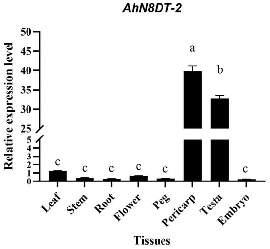 Expression validation of AhN8DT-2 gene in different tissues of peanut by qRT-PCR. AhN8DT-2 showed high expression in the pericarp and testa, while the expression level was too low in all other tissues. Data were analyzed by 2−ΔCT method, and significance levels were determined by ANOVA. Letters a, b, and c represent the significance levels with α = 0.05.