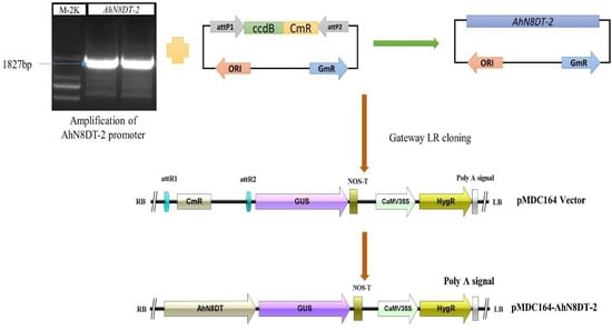 For cloning of the AhN8DT-2 promoter, the 1827bp upstream region was PCR-amplified from the DNA template peanut variety XHXL using specific primers (Table S5). After verifying the promoter sequence, the gateway adapter sequence was annealed to the promoter fragment by PCR with gateway primers. Then, the entry vector was constructed by annealing the promoter between the attP sites of the pDONR207 vector through BP reaction. The promoter sequence was verified again and then annealed between the attR sites of the pMDC164 expression vector through LR-cloning. In this way, the expression vector pMDC164-AhN8DT-2P was successfully constructed. The complete process of vector construction is shown in Figure 4. The vector was transformed into A. tumefaciens cells by the method of heat shock. Expression vector harboring Agrobacterium colonies selected on YEB + Rif + Km selection medium and further used for genetic transformation of Arabidopsis plants by floral dipping [15]. Positive T0 plants were selected on MS+HygR medium and genetically verified through PCR with genomic DNA. The positively transformed seedlings were healthy and green, while the non-transformed seedlings turned yellow and stopped growing. Eight healthy and green seedlings were verified by PCR-based amplification.