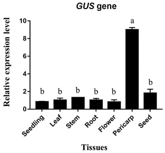 The real-time expression of the UidA gene (GUS) in different tissues of transgenic plants was analyzed by qRT-PCR (Figure 7). For the qRT-PCR analysis, RNA from seedlings, leaves, roots, stems, flowers, pericarp (silique outer coverings), and seeds were extracted using the TriQuick reagent. RNA from whole seeds was extracted to measure the expression in the seed coat, embryo, and cotyledons together. Quantitative real-time PCR revealed a comparatively higher expression of the GUS gene in the pericarp of transgenic plants than in any other tissues (Figure 7).