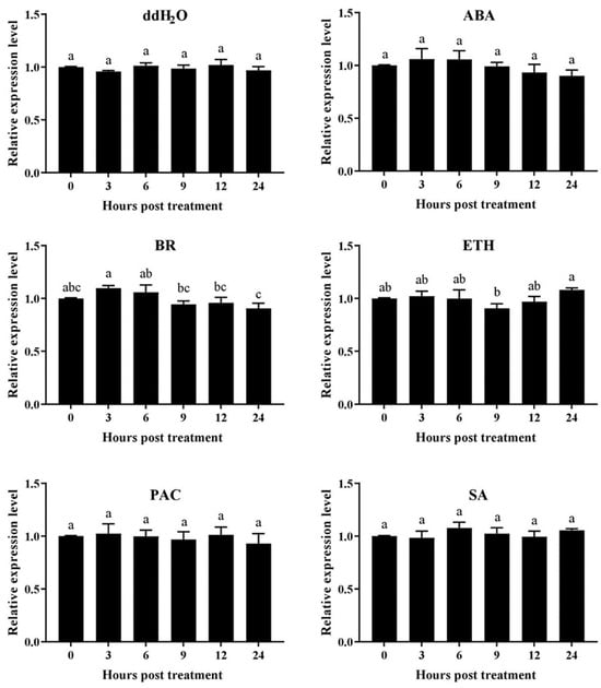 The response of the AhN8DT-2-controlled GUS gene to different hormone treatments was that there was no change in the expression level of the GUS gene in response to different hormones and ddH2O spray at all time points (in accordance with transcriptome expression). ABA = abscisic acid, BR = brassinolide, ETH = ethphon, PAC = paclobutrazol, and SA = salicylic acid. Data were analyzed by analysis of variance (ANOVA), letters a, b and c show the statistical significance levels with p < 0.05).