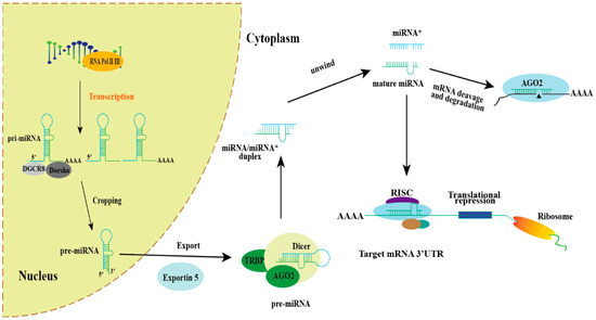 MicroRNAs (miRNAs) constitute a class of diminutive non-coding RNAs, encoded by endogenous genes of approximately 18–25 nucleotides in length, which play crucial roles in development and disease [19]. The cellular biogenesis of miRNAs is a complex, multistep process that involves transcription from various genomic regions, including the exons and introns of host genes as well as intergenic fragments [20]. The biosynthesis of miRNAs begins in the nucleus, and mature miRNAs are produced in the cytoplasm. MiRNAs are predominantly transcribed via RNA polymerase II-dependent transcription, and then undergo capping, splicing, and polyadenylation to form primary miRNAs (pri-miRNAs), which have one or more hairpin structures and can be up to thousands of nucleotides in length [21,22]. The Drosha–DiGeorge Syndrome Critical Region 8 (DGCR8) complex mediates the processing of pri-miRNAs into precursor hairpins, which have an approximate length of 70 nucleotides. These precursor hairpins, known as pre-miRNAs, are then translocated into the cytoplasm via exportin-5 through the nuclear pore [23,24]. Another RNA enzyme, Dicer, breaks down pre-miRNAs into double-stranded RNA duplexes in the cytoplasm, i.e., miRNA strands and their complementary sequences (miRNA/miRNA*). MiRNAs orchestrate post-transcriptional gene silencing by precisely targeting the 3′ untranslated region (UTR) of mRNA, with particular emphasis on the seed region located at the 5′ end spanning nucleotides 2–7 [25]. Mature miRNAs can bind to the Ago-2-containing RNA-induced silencing complex (RISC) and mediate gene silencing, resulting in mRNA breakage or translational repression, while the other miRNA* strand is degraded [26,27]. As a major regulator of basic biological processes, miRNAs are able to regulate cell differentiation, proliferation, and apoptosis [28]. MiRNAs exert their biological functions by inhibiting downstream gene expression, mainly through transcriptional inhibition and mRNA cleavage or degradation, and indirectly regulate pathophysiological states [29]. MiRNAs bind to complementary target sequences in mRNA, interfere with translation mechanisms, alter or prevent the production of protein products, and thus regulate mRNA expression through different pathways [30]. The binding of miRNAs to target mRNAs also triggers the binding of mRNA attenuators, leading to mRNA instability, decreased expression levels, and even degradation [31,32,33]. MiRNAs have garnered extensive research attention due to their pivotal role in neuronal development and brain function [34]. Numerous studies have unequivocally demonstrated the active involvement of miRNAs in the pathophysiological mechanisms underlying SCZ [35,36,37]. The process of miRNA biogenesis is illustrated in Figure 1.