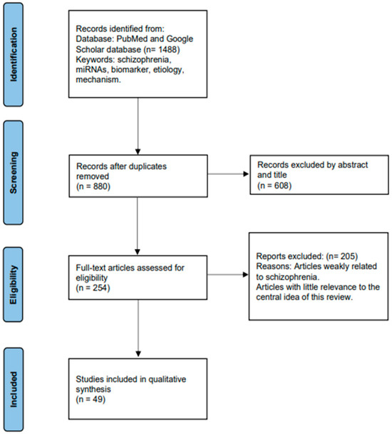 The studies included in this review all investigate the role of miRNAs in SCZ. Initially, a comprehensive search yielded a total of 1488 articles related to the association between SCZ and miRNAs. After removing duplicates, the remaining articles underwent screening based on their titles and abstracts. Subsequently, 254 articles were thoroughly analyzed in full text and selected for inclusion in this study. Among these 254 articles, 49 compared miRNA expression differences between SCZ patients and healthy controls (HCs), observing improvements in miRNA expression levels following medication. Additionally, significant differences in miRNA expression before and after treatment were found by some studies, suggesting their potential as biomarkers for SCZ. Furthermore, certain studies have elucidated the regulatory mechanisms through which miRNAs may contribute to the pathogenesis of SCZ. The process of article selection is illustrated in Figure 2 using the PRISMA Flowchart.