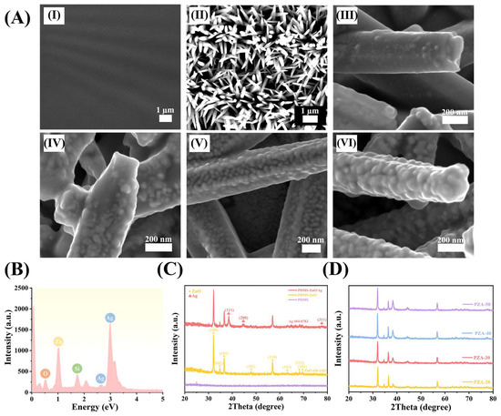 (A) SEM images of (I) PDMS, (II) PDMS-ZnO and PDMS-ZnO/Ag with different sputtering times of (III) 20 s, (IV) 30 s, (V) 40 s and (VI) 50 s. (B) EDS spectra of PZA-40. XRD patterns of (C) PDMS, PDMS-ZnO and PDMS-ZnO/Ag and (D) PZA-20, PZA-30, PZA-40 and PZA-50.