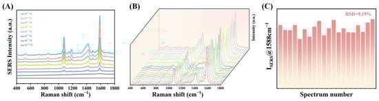 The sensitivity and uniformity of PDMS-ZnO/Ag film were also evaluated. The SERS spectra of 4-MBA, which was absorbed on PZA-40 at concentrations ranging from 10−3 to 10−10 M, was recorded. Figure 4A indicates that the SERS signal strength of 4-MBA falls as the concentration drops, with the limit of detection (LOD) of 10−9 M. Compared to other developed SERS substrates, our suggested SERS platform has the greatest SERS sensitivity, as indicated in Table 1 [63,64,65,66]. The SERS enhancement factor (EF) was computed in detail and is available in Supplementary Materials to assess the SERS substrate performance in more depth. The EF value of PZA-40 is as high as 3.3 × 105, while the EF values for PDMS-Ag and PDMS-ZnO are only 1.0 × 105 and 6.0 × 103, respectively. For the SERS substrate, good homogeneity is just as crucial as high SERS sensitivity. SERS spectra of 4-MBA (10−5 M) were obtained by picking at random 20 different spots on PZA-40 to assess the uniformity of the PZA-40 SERS substrate. It is apparent from Figure 4B,C that the relative standard deviation (RSD) value of the SERS signal strength is lower than 10% at 1588 cm−1 and the signal strength remains nearly constant. The great sensitivity and excellent uniformity of our SERS platform are demonstrated by all of the above results.