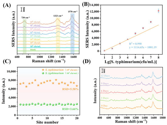 In total, 10 µL of S. typhimurium with concentrations ranging from 101 to 108 cfu/mL was dripped onto Apt-modified PDMS-ZnO/Ag films. After drying, the films were placed on a SERS detection slide for SERS detection [81,82]. Parameter settings were consistent with Section 3.4 throughout the SERS spectrum collection process.