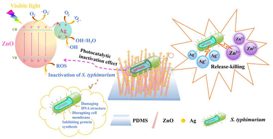 As well as sensitively detecting S. typhimurium, it is also urgent to effectively inactivate bacteria. In recent years, photocatalytic sterilization has gained recognition as a simple, environmentally friendly, efficient and low-cost method for eliminating bacteria [37]. Under visible light irradiation, photo-induced charge carriers are generated, which can interact with O2 and H2O to create reactive oxygen species (ROS) like hydroxyl radicals (·OH) as well as reactive oxygen ions (·O2−) which are free radicals [38,39]. Given the potent oxidizing abilities of ROS, they have the capability to effectively destroy the bacterial cell membrane as well as wall structure through the oxidation process, leading to the outflow of metabolites from internal cell substances and thereby achieving the desired sterilization effect [40]. The combination of ZnO and Ag, fortunately, not only makes it possible for SERS detection with extreme sensitivity, but also works incredibly well as a photocatalytic sterilization agent [41]. It should be noted that although ZnO nanoparticles have weak antibacterial activity, modification with the noble metal Ag can generate significant antibacterial activity [42]. On one hand, due to work function and band alignment differences between the noble metal and semiconductor, a Schottky barrier will form at their interface. This enhances photocatalytic activities by successfully promoting e− and holes (h+) to separate [43]. On the other hand, Ag nanocrystals are considered to have a wide range of bactericidal effects, and, even at very low concentrations, Ag has strong sterilization activity [44]. Therefore, combining the bactericidal activity of ZnO/Ag nanohybrids with photocatalytic sterilization is a promising strategy to achieve a dual sterilization effect and thus trigger bacterial death [45]. In addition, the addition of aptamers and PDMS in the ZnO/Ag nanocomposites endows them with exceptional selective recognition/targeting ability and enrichment abilities, thereby inactivating them more effectively [46,47]. But, up until now, the majority of research only focused on constructing a single-function biological system that could either detect or eliminate S. typhimurium. Little research has been devoted to the combination of high sensitivity detection and bacterial inactivation to prevent S. typhimurium infection.