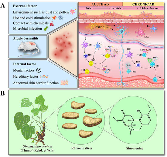Pathogenesis of AD and source of SIN: (A) The sketch of the pathogenesis of atopic dermatitis, (B) Sinomenium acutum, rhizome slices, and the structure of sinomenine.