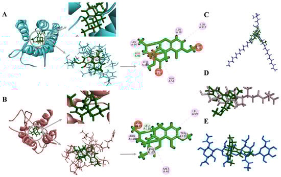 Molecular docking of SIN through Discovery Studio 4.5: (A) IL4 and SIN, (B) IL2 and SIN, (C) Cholesterol and SIN, (D) Phospholipid and SIN, (E) Hydrogel and SIN.