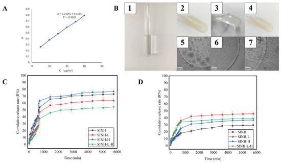 Characteristics of SINH. (A) Standard curve of determination of SINH. (B) The appearances of SINH, SINH-L, SINH-H, and SINH-L-H (1–4) and the images of SINH-L, SINH-H, and SINH-L-H under the cryo-EM (5–7). (C) Cumulative release curve of SINH and its three preparations through the dialysis membrane at different time points. (D) Cumulative release curve of SINH and its three preparations through mice skin at different time points.