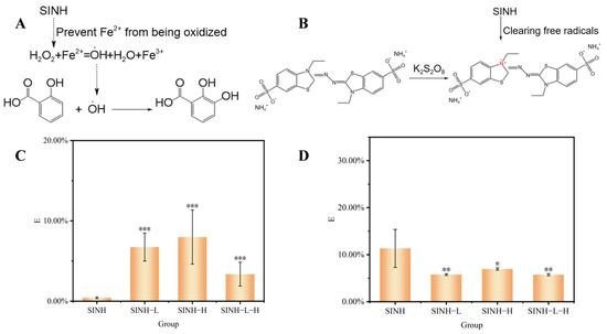 Characteristics and antioxidant activity of SINH and its formulations. (A) Fenton reaction mechanism of SINH, (B) SINH scavenging ABTS+ reaction, (C) The effect of SINH, SINH-L, SINH-H, and SINH-L-H on scavenging hydroxyl radicals, (D) The effect of SINH, SINH-L, SINH-H, and SINH-L-H on scavenging ABTS radicals (* p < 0.05, ** p < 0.01, *** p < 0.001: Pharmaceutical preparation group vs. SINH group).