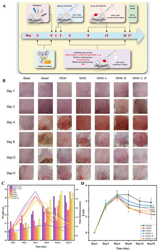 The establishment of the AD mouse model and the time point of drug administration according to Figure 5A. The body weight and skin thickness of each group of mice are shown in Figure 5B, and the skin healing is shown in Figure 5C. The mice in the blank group showed an increasing trend in body weight and skin thickness, with smooth hair, good condition, and no abnormal behavior; the ears were red and transparent, with an intact appearance and clearly visible blood vessels. The body weight of mice in the other groups peaked on the fourth day and decreased thereafter, among which the body weight of mice in the positive control group with ointment decreased more rapidly, presumably due to the side effects caused by dexamethasone as a kind of glucocorticoids. After 2,4-dinitrochlorobenzene (DNCB) excitation twice, erythema appeared on the dorsal skin of mice in each group and gradually thickened and dried, with scabs appearing, and mice scratched frequently and became agitated. On the 4th day, the erythema and thickening of the skin of the mice in each group were gradually reduced, and the skin of the mice in the positive control group was obviously thinner, with slight folds and erythema and no hair growth at the excitation site. As shown in Figure 5D, compared with the model group, the skin injury scores of mice in the model group were significantly higher than those in the normal control group, and the skin scores of mice in the positive control group were significantly lower than those in the SINH-L-H group.