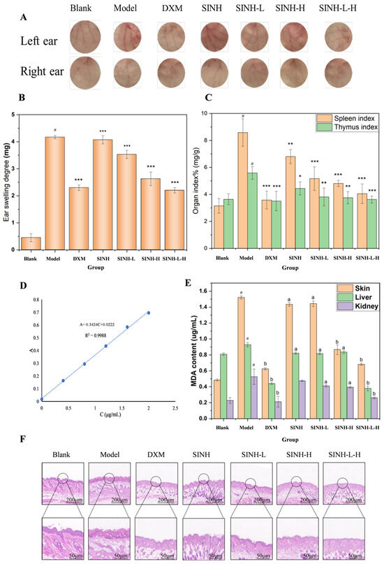 Effect of SINH-L-H on eczema mice. (A) Effect of SINH-L-H on mice ears in eczema mice; (B) Effect of SINH-L-H on ear swelling in AD mice (Compared with the blank group: # p < 0.001; compared with the model group: *** p < 0.001); (C) Effect of SINH-L-H on the organ index of AD mice (# p < 0.001: model group vs. blank group; * p < 0.05, ** p < 0.01, *** p < 0.001: drug group vs. model group); (D) MDA standard curve; (E) Effect of DNCB induction on MDA content in various tissues of mice (, n = 10) Note: Compared with blank group: # p < 0.001; compared with model group: a p < 0.01, b p < 0.001; (F) Pathological skin changes on the back of each group of mice.
