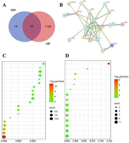 Molecular formation and target screening of drug systems: (A) Venn diagram of AD and SIN targets, (B) Bubble diagram of target PPI, (C,D) GO and KEGG enrichment.