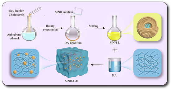 The synthesis of SINH-L, SINH-H, and SINH-L-H was adopted from our previous work as cited [23] (Figure 8). Took 0.3 g of phospholipids and 0.1 g of cholesterol in a rotary evaporation flask, added the appropriate amount of absolute ethanol to dissolve, fixed the flask on a rotary evaporator to rotated and evaporated to form a thin film, set the temperature at 70 °C, vacuum pressure at 70 kPa, speed at 100 r/min until the absolute ethanol evaporated completely. Then, 10 mL of 2 mg/mL of SINH solution was added to the film and rotated and hydrated for 30 min to form a milky white suspension. The suspension was sonicated for 10 min and filtered across the 0.22 μm microporous membrane three times to obtain SINH-L. 0.1 g HA was added to the prepared 10 mL SINH-L suspension and stirred at the speed of 100 rpm for 12 h with a magnetic stirrer till HA naturally swelled to form a uniform hydrogel (SINH-L-H). 0.1 g of HA was also added to 10 mL of SINH solution, and the same was used to form SINH-H. In addition, blank liposomes (B-L) with PBS instead of SINH solution, blank liposome hydrogels (B-L-H) with B-L instead of SINH-L, and blank HA hydrogels (B-H) with PBS instead of SINH solution were prepared.