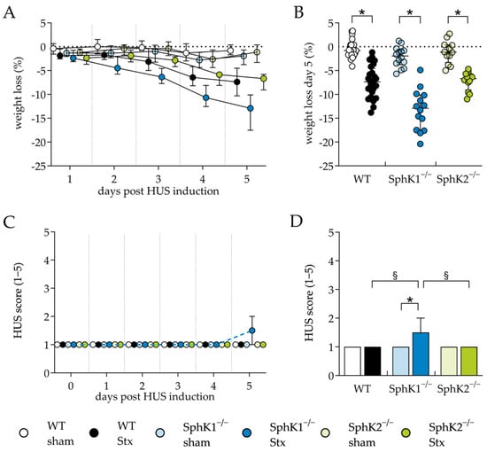 The mice used in this study were bred in a specific pathogen-free environment. Throughout the acclimatization (7 d) and experimental period (5 d), the ambient temperature was 21 °C ± 2 °C and the relative humidity was 55% ± 10%. A maximum of five mice per cage were housed under standardized laboratory conditions and with standard rodent chow and water ad libitum at the animal facility of the university hospital of Jena. To determine the required sample size per group a priori, the software G*Power 3.1.9.7 was used, as described by Faul et al., 2007 []. Efforts were made to keep the number of animals as low as possible. Experimental HUS was induced in 10- to 17-week-old male C57BL/6J WT, SphK1−/−, and SphK2−/− mice by i.v. injections of Stx2 from one purification batch on days 0 and 3, accompanied by volume resuscitation with 800 µL of Ringer lactate solution s.c. 3 times daily. Mice weighting 20–30 g received 2x 25 ng Stx2/kg bodyweight (WT Stx (n = 24), SphK1−/− Stx (n = 14), SphK2−/− Stx (n = 12)), or 0.9% NaCl (WT sham (n = 24), SphK1−/− sham (n = 14), and SphK2−/− sham (n = 12)). The WT and mutant mice were held in separate cages. Where possible, both treatment groups were distributed evenly in a cage. If there was an odd number of animals per cage, the last animal was distributed at random. Mice and treatment identification was ensured by pollutant-free color-coded tail markings. Bodyweight and HUS score (Supplementary Table S1) were monitored for 5 days, as described previously []. Mice were sacrificed on day 5 or upon reaching humane endpoints (see termination criteria in Supplementary Table S1) to comply with ethical regulations. The animals were exsanguinated in deep ketamine/xylazine anesthesia (100 mg/kg bodyweight ketamine; 10 mg/kg bodyweight xylazine). All in vivo experiments were approved by the regional animal welfare committee (Thuringian State Office for Food Safety and Consumer Protection, Bad Langensalza, Germany, registration number 02-073/16) and were performed in accordance with German legislation and the approved ARRIVE guidelines. Blood withdrawal occurred from the vena cava, followed by whole-animal perfusion with 0.9% NaCl to remove the remaining blood cells, and organ harvesting. Assessments of the outcome measures for the mice were carried out in a blinded manner and allocations were conducted before statistical analysis.