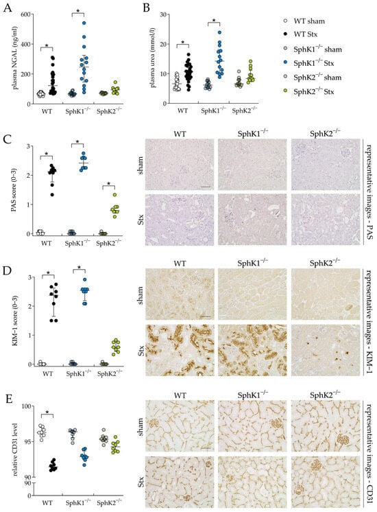 The kidney is the organ most affected by Stx in mice due to the high levels of Gb3 in renal vascular endothelial cells [] and most likely also in tubular epithelial cells []. Therefore, we investigated the effect of either SphK1 or SphK2 deletion on renal damage and functional parameters during experimental HUS development. The Stx2-challenged WT and SphK1−/− mice compared to the corresponding sham mice, showed significantly increased plasma levels of the renal damage biomarker neutrophil gelatinase-associated lipocalin (NGAL, Figure 3A) and renal dysfunction biomarker urea (Figure 3B). In the Stx2-challenged SphK2−/− mice, compared to the corresponding sham mice, the levels of both markers remained unchanged. In line with these findings, periodic acid Schiff (PAS, Figure 3C) staining revealed significant pathological alterations in the kidneys of the Stx2-challenged WT and SphK1−/− mice compared to the corresponding sham mice, respectively. In detail, histological staining revealed tubular dilatation, flattened tubular epithelium, PAS-positive protein casts, loose cellular material and severely damaged proximal tubules in the kidneys of these Stx2-challenged mice. Glomerular damage was not observed, as in murine HUS, tubular damage rather than glomerular damage occurs [,]. In the Stx2-challenged SphK2−/− mice compared to the corresponding sham mice, the PAS score was also significantly increased. However, this increase was much lower compared to the Stx2-challenged WT and SphK1−/− mice. The kidney injury molecule-1 (KIM-1) score was significantly increased in the Stx2-challenged WT and SphK1−/− mice (Figure 3D), whereas the score of the Stx2-challenged SphK2−/− mice was not significantly altered compared to the corresponding sham mice. Vascular endothelial cell damage was quantified by analyzing the relative levels of CD31, a histological marker for endothelial cell presence. The relative CD31 levels were significantly decreased in the renal tissue of the Stx2-challenged WT mice compared to the corresponding sham mice (Figure 3E). The decrease in relative CD31 levels was less pronounced in the Stx2-challenged SphK1−/− and SphK2−/− mice compared to the corresponding sham groups with almost equal relative CD31 levels in the Stx2-challenged SphK2−/− mice compared to the corresponding sham group. Thus, the analysis of renal damage and dysfunction parameters indicated a protective effect of SphK2 deletion against the development of severe renal injury and dysfunction during the progression of experimental HUS.