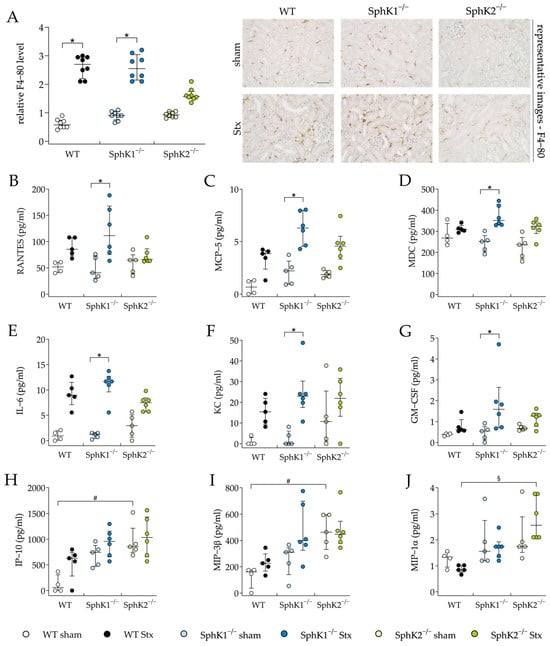 Kidney injury and dysfunction during HUS development can be aggravated by the renal infiltration of immune cells that were initially attracted by cytokines secreted by the Stx-damaged endothelial and epithelial cells (reviewed in []). Therefore, we exemplarily investigated renal immune cell infiltration by quantifying the relative F4-80 levels representing macrophage invasion, and examined cytokine secretion by a plasma cytokine and chemokine analysis. The relative F4-80 levels were significantly elevated in the Stx2-challenged WT and SphK1−/− mice compared to the corresponding sham groups, but not in the Stx2-challenged SphK2−/− mice (Figure 4A). In the Stx2-challenged SphK1−/− mice compared to the corresponding sham mice, the plasma levels of the cytokines interleukin (IL)-6 and granulocyte-macrophage colony-stimulating factor (GM-CSF) and the chemokines Regulated And Normal T cell Expressed and Secreted (RANTES), monocyte chemoattractant protein (MCP)-5, macrophage-derived chemokine (MDC), and keratinocyte-derived chemokine (KC) were significantly increased (Figure 4B–G). In the SphK2−/− sham mice compared to the WT sham mice, the plasma levels of the chemokines interferon gamma-induced protein (IP)-10 (Figure 4H) and macrophage inflammatory protein-3-beta (MIP-3β) (Figure 4I) were significantly increased. Further, in the Stx2-challenged SphK2−/− mice compared to the Stx2-challenged WT mice, significantly increased plasma levels of macrophage inflammatory protein-1-alpha (MIP-1α) were observed (Figure 4J). The levels of other cytokines and chemokines included in the plasma analysis remained unchanged in all experimental groups (Supplementary Table S7). In summary, the deletion of SphK1 aggravated the inflammatory microenvironment in mice with experimental HUS. The SphK2−/− mice exhibited alterations in their intrinsic chemokine balance and were protected from renal macrophage invasion during the development of experimental HUS.