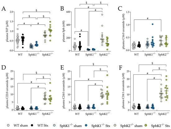 Sphingolipid levels in plasma from WT, SphK1−/−, and SphK2−/− mice with experimental hemolytic-uremic syndrome. Mice received vehicle (sham) or were challenged with Stx2 to induce experimental HUS. To assess changes in plasma sphingolipid levels from mice with experimental HUS, levels of (A) S1P, (B) Sph and the ceramide (Cer) species (C) C16:0 Cer, (D) C22:0 Cer, (E) C24:0 Cer, and (F) C24:1 Cer were determined by LC-MS/MS. Data are expressed as scatter dot plots with median (interquartile range) for n observations. (A,D–F): WT: n = 24, SphK1−/−: n = 14, SphK2−/−: n = 11, (B): WT sham: n = 24, WT Stx: n = 23, SphK1−/− sham: n = 13, SphK1−/− Stx: n = 13, SphK2−/− sham: n = 10, SphK2−/− Stx: n = 10, (C): WT sham: n = 14, WT Stx: n = 11, SphK1−/− sham: n = 13, SphK1−/− Stx: n = 12, SphK2−/− sham: n = 10, SphK2−/− Stx: n = 10. Kruskal–Wallis test + Dunn’s multiple comparison test: # p < 0.05: sham groups comparison, § p < 0.05: Stx groups comparison. Cer, ceramide; HUS, hemolytic-uremic syndrome; S1P, sphingosine-1-phosphate; Sph, sphingosine; SphK, sphingosine kinase; Stx, Shiga toxin; WT, wild type.