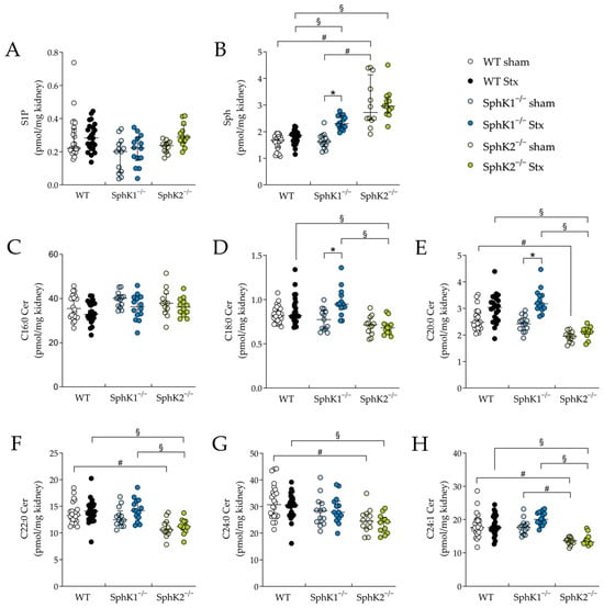 Sphingolipid levels in renal tissue from WT, SphK1−/− and SphK2−/− mice with experimental hemolytic-uremic syndrome. Mice received vehicle (sham) or were challenged with Stx2 to induce experimental HUS. To assess changes in sphingolipid levels in renal tissue from mice with experimental HUS, levels of (A) S1P, (B) Sph and ceramide species (C) C16:0 Cer, (D) C18:0 Cer, (E) C20:0 Cer, (F) C22:0 Cer, (G) C24:0 Cer, and (H) C24:1 Cer were determined by LC-MS/MS. Data are expressed as scatter dot plots with median (interquartile range) for n observations. (A–H): WT sham: n = 24, WT Stx: n = 24, SphK1−/− sham: n = 13–14, SphK1−/− Stx: n = 14, SphK2−/− sham: n = 12, SphK2−/− Stx: n = 12. Kruskal–Wallis test + Dunn’s multiple comparison test: * p < 0.05: Stx group vs. the corresponding sham group, # p < 0.05: sham groups comparison, § p < 0.05: Stx groups comparison. Cer, ceramide; HUS, hemolytic-uremic syndrome; S1P, sphingosine-1-phosphate; Sph, sphingosine; Stx, Shiga toxin; SphK, sphingosine kinase; WT, wild type.