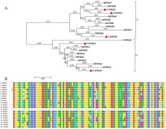 To further explore the evolutionary relationships and structural domains of CsFBA proteins, multiple sequence alignments of protein sequences from AtFBAs, SlFBAs, and CsFBAs were conducted (Figure 1B). Specifically, 100 amino acid sequences from the N terminal, containing the structural domains, were selected for this analysis. The results indicated that the sequences within the structural domain were highly conserved, with the exception of SlFBA5.