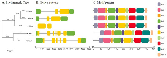 Phylogenetic tree, gene structure, and motif pattern of CsFBA proteins. (A) The phylogenetic tree was constructed using the full-length sequences of CsFBA proteins with 1000 replicates on each node. (B) Green rectangles, yellow rectangles, and black lines indicate UTRs (non-coding regions), CDSs (coding sequences or exons), and introns, respectively. (C) The amino acid motifs (numbered 1–10) in CsFBA proteins are displayed in ten colored boxes, and black lines indicate amino acid length.